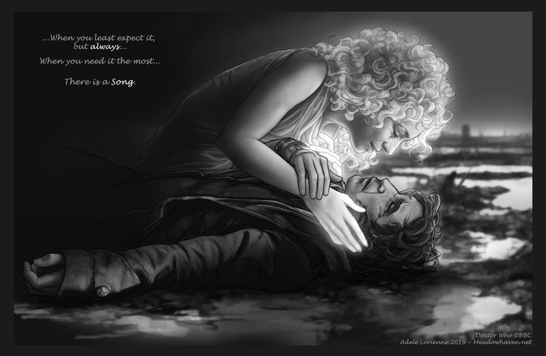 A commissioned painting of the Eighth Doctor and River Song on a muddy battlefield, but only one of them is really there. Inspired by a scene from the heartbreaking and amazing “Dark Eyes” audio series from BigFinish; the quote is from the TV episode “The Husbands of River Song.”