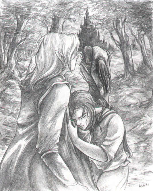 Bwah, shading forests takes so loooong.. *falls over* Anyhoo, an attempt at making a scene in motion, without the characters’ faces being the point of it all. Morgan’s being carted off by Nomi, mwahah, and a Craven is entreating Falen on behalf of his people. That’s the Craven castle and Vael mountains in the background.